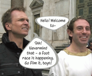 So, Jon’s in the gladiator ring again, but this time he completes the moves correctly pushing him and Jessica into first place as they make their way to the next location, the Piazza Di Spanga – the Spanish Steps. They get into a taxi and the driver doesn’t seem to know where to take them. At the chariot race, one of the Cowboys, I think, makes a joke that the chariots are like taxi drivers from Sri Lanka – ha ha ha ha ha. Despite the chaos on the course, though, Brenchel finishes and joins the J Team on their way to the steps. The Cowboys, Dave and Conner are not far behind them and the Globetrotters are glad to have the track to themselves for a bit because it helps them get through it quickly. Now the Blondes are by themselves and they just going to consider themselves eliminated enjoy the day’s activities and just have fun. I think it’s that “let’s just have fun with this” attitude that helped them focus and stay calm…