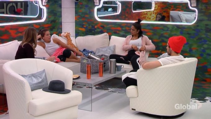 Ali, Liv, Derek and Kaela talk about how Kaela would’ve backdoored Erica if Johnny used the veto. They say that Johnny has gotten in her head, and they think that Erica would target Daela next week. UGH. BBCAN, you so could’ve edited Wednesday’s show to emphasize these conversations. They believe that Erica and Johnny are targeting Daela next week. In DR, Derek says that Johnny and Erica are the last two to come out of their bedroom, and he thinks that they are 100% working together. It’s okay for each of them to have a partner, but Erica and Johnny can’t? On the feeds, they discussed taking Johnny out before Erica. They all promise loyalty to each other as duos.