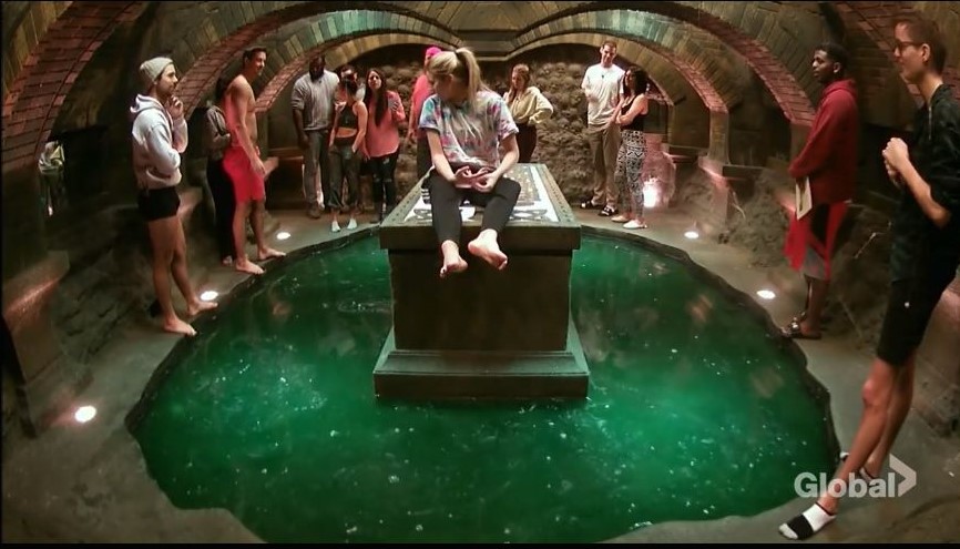 Veronica and Merron announce that Ryan must choose 4 Have Nots for the week and that they aren’t eligible to be selected. He says that Andrew kept him off slop last week, and he’s returning the favor this week. He says that people that were in Heaven last week will be the Have Nots. He selects Erica, Hamza, Jesse and Derek, and the houseguests get to see the Catacombs Have Not room. They’re creeped out by the spider webs and the large tomb with green slimy water surrounding the it.
