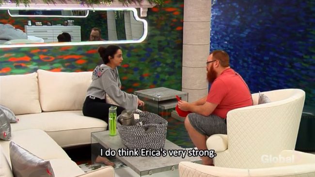 Feeds updates: Ryan said he needs to separate himself from Andrew because he wasn’t part of trying to flip the vote last week. Will admitted on the feeds that he threw the HOH to Ryan because he wanted to compete in the next HOH. Everyone is supposedly on board with the 4-week plan, but alliances are forming. Right now, it seems like the red room verses the white room. There is still a house mentality, but Paras is being paranoid about Erica’s social game and tried to paint a target on Olivia. Ryan asked everyone before the nominations who they would see as a potential backdoor target, and he told certain people that their names were being tossed around by multiple people. Ryan called a house meeting to let Veronica and Merron know that everyone believes their story is bullshit. Veronica talks over Merron, saying that if they tell them the truth of their twist, something bad will happen to the house. (Perhaps Kirsten and Mikey would be unleashed??) Merron says his peace after Veronica.