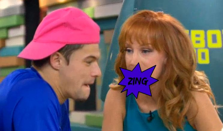 Victoria, Donny and Christine are all picked to play and for the Detonators this was the worse case scenario. Now they have to make sure that Donny or Victoria don’t win this so they can get one of the two boys off the block.This is the episode EVERY Big Brother fan never misses. ZINGBOT is back, but he’s a bit different this year. Somebody broke him and now he’s PROPSBOT but don’t worry, he brought comedienne Kathy Griffin as back up. While Zingbot tells Donny he loves his beard but wishes it didn’t cover his handsome face Kathy steps in with some great Zings. Of course we have a Caleb/Amber zing. How can you not? Kathy tells Caleb he and Amber have something in common. While he thinks she’s drop dead gorgeous she thinks he should just drop dead! ZZIIIINNNGGG! Kathy then tells us a little joke “What do you call