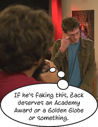 What happens next isn’t an all out explosion, but the malfunctioning synapses in Zack’s brain, the ones that are used to judge social situations and control what words come out of his mouth, cause his psyche to rev into defense mode to save his ego. Everyone else wants to have a mature, rational conversation, but the gravity of the situation is just too much for Zack to handle. There’s just too much pressure and it causes him to crumble. Instead of trying to talk it out with his team, he says anything and everything he can to build himself a pedestal on which to stand. He’s in the fourth dimension, all of space and time is unfolding in his mind,