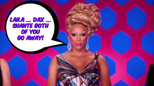 ExclamationPoint. They must both lip synch for their lives to Gloria Gaynor’s “I Will Survive,” one of the most iconic signs a queen could lip synch to. In the words of RuPaul, “Good luck and DON’T FUCK IT UP.” But, alas, the queens both fucked it up! They both gave a very lackluster, boring performance. Ru decides that neither Laila nor Dax deserves to be there so he asks them both to sashay