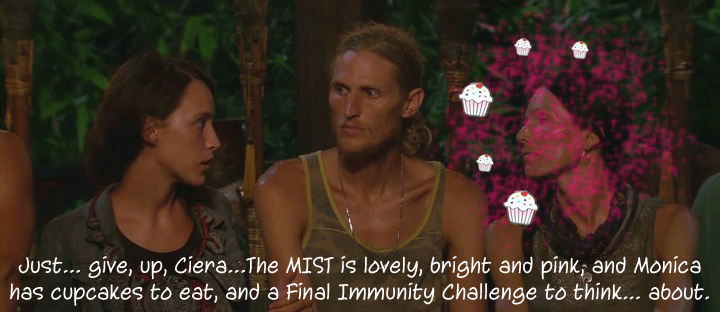 Anyway… It appears that Tyson has indeed Survivor-Misted Monica. Her emotional response to Tyson and Gervase voting to keep her in the game, and her jokey attempt at pulling Ciera over the line in the sand and back into their alliance proves that Monica is not playing Survivor. Sure, all the talking makes it seem like she’s doing something, but it couldn’t be further from actual strategy. If Monica’s head was in the game, she would have known she was the swing vote in the upcoming Tribal Council as soon as Katie was rocked out and she would have made some deals to secure an end-game alliance. Ciera tried to tell her the truth, but she couldn’t swat away the mist in Monica’s eyes. Monica not flipping over to Hayden and Ciera’s side of the beach is the Million Dollar Decision that will lose her the money.