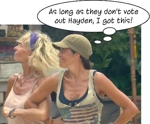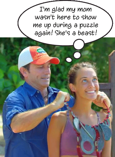 Without her Puzzle Mom around, Ciera shined in the Immunity Challenge and won a nice meal for herself and Hayden – to enjoy at camp!? What’s up with all these food rewards taking place at camp in front of everyone? Usually the players are whisked away to enjoy their rewards at some other location, (a chance to “getaway” from the game for awhile), and this far into the game, one reward also usually involves an overnight stay with showers and clean clothes. Was there not enough money in the budget this season to buy all