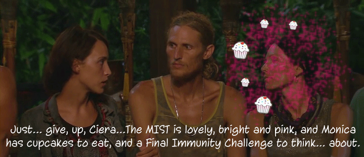 Anyway… It appears that Tyson has indeed Survivor-Misted Monica. Her emotional response to Tyson and Gervase voting to keep her in the game, and her jokey attempt at pulling Ciera over the line in the sand and back into their alliance proves that Monica is not playing Survivor. Sure, all the talking makes it seem like she’s doing something, but it couldn’t be further from actual strategy. If Monica’s head was in the game, she would have known she was the swing vote in the upcoming Tribal Council as soon as Katie was rocked out and she would have made some deals to secure an end-game alliance. Ciera tried to tell her the truth, but she couldn’t swat away the mist in Monica’s eyes. Monica not flipping over to Hayden and Ciera’s side of the beach is the Million Dollar Decision that will lose her the money.
