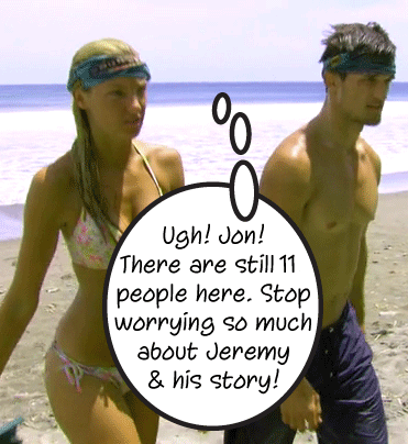 This week on Survivor… Missy can hardly believe that Julie quit the game; her alliance had a plan to vote Josh out and they didn’t get to do that since they didn’t go to Tribal. Little does she know that the wrinkle in the plan actually saved her alliance member, Jeremy, since Jon and Jaclyn, (Team Double J), were going to side with Josh’s alliance, not hers, to vote him out of the game. Alone on the beach together, Team Double J, well mostly Jon, discuss their position in the game, going back and forth between two alliances, potentially blindsiding someone, maybe being deceitful. They didn’t go to Tribal, though, so their next move is a big move because they are going to take out pack leader Jeremy and Jon is just so happy that he and Jaclyn are in the middle instead of on the receiving end of the votes.
