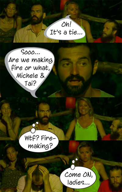 And awaaay we go to Tribal Council! I’m gonna try to speed things up because I know how late I am in posting this, but I work full-time hours and I was too giddy Sunday in anticipation of Kathy to take advantage of my ONLY day off work in which I can fully focus on writing these… I have to work on Fridays and Saturdays, folks – I make the most money at my jobs those days, but I’m going to try to work something out for Big Brother. I can afford to take a few more hours off my work schedule – just not Friday and Saturday. I’m filling half of the paragraph with this babble because the best thing about Tribal Council at this point in the game is the expressions on the faces of the people in the Jury. Everything that’s said is typical from contestants… at this point in the game. The only thing about this Tribal that matters is the vote because it’s a Tai – I mean tie – Between Aubry and Cydney, which means that Tai did NOT betray his true alliance. When Jeff asks Michele and Tai if they are solid on their votes, they say they are both firm on the matter and it is Fire-Making Challenge Time… Which is why ANYONE that plans on being on Survivor in the future should LEARN how to MAKE FIRE; if you don’t do it before, do it on the island, but DO IT BEFORE! Seriously… Knowing how to make fire, especially without flint, but with it too, is pretty useful when you’re playing Survivor… In case you weren’t aware… FAST FORWARD: Aubry is successful in making fire first. It’s a little dicey there for awhile and it takes a little longer than it should, but she walks away with the win and stays in the game sending Cydney do the Jury. If you want to watch it all play out, by all means, go to cbs.com and do what you gotta do to watch it because it’s a good episode, but for the sake of a quick blog post – Aubry wins, Cyd is fired out of the game.