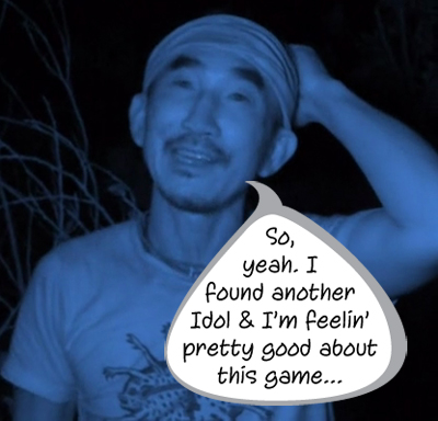 This is great for Brad, but all he has is Brad and Sierra so he’s still got some work to do. Over at Nuku, Sandra feels pretty confident that once she gets her feet wet she’ll be back on top of things with this new tribe, buuut… Elsewhere, Zeke is telling Ozzy that Sandra has to be their target and Ozzy agrees – Andrea and Sarah do too, but they all agree that they have to make it seem to Varner and Sandra that they are both safe so they hatch a plan to tell them that they are voting out Tai. Later alone with Zeke, Tai tells him that yeah, Sandra is the obvious vote. Zeke is still worried about Tai because he’s known to be all flip-floppity so this plan could blow up in their faces. And Tai is worried about everyone thinking he’s dangerous – they could easily flip on him and put his head on the chopping block sooo… Tai heads to this camp’s water well to see if he can find a symbol on one of the boards around it – and he does! So, now Tai has two Idols and he couldn’t be happier, but he doesn’t have any idea of how he might use them.